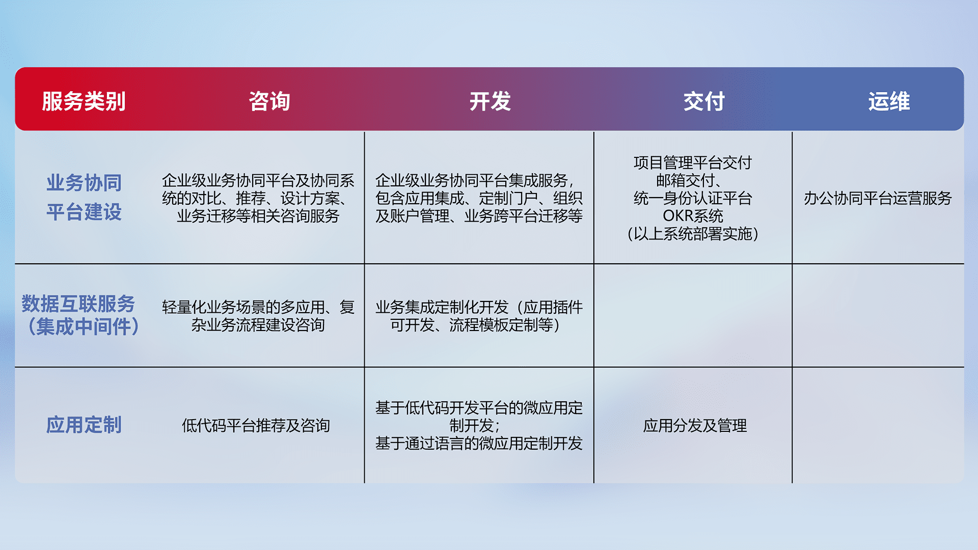 针对钉钉、、、、企微、、、、IDaas等平台级产品提供产品的规划、、、方案、、交付、、、、定制化开发等服务,,,,实现如统一协同办公、、、、智能客户服务、、、混合会议管理、、、智能数据查询、、、等业务场景,,实现数字化转型。。。