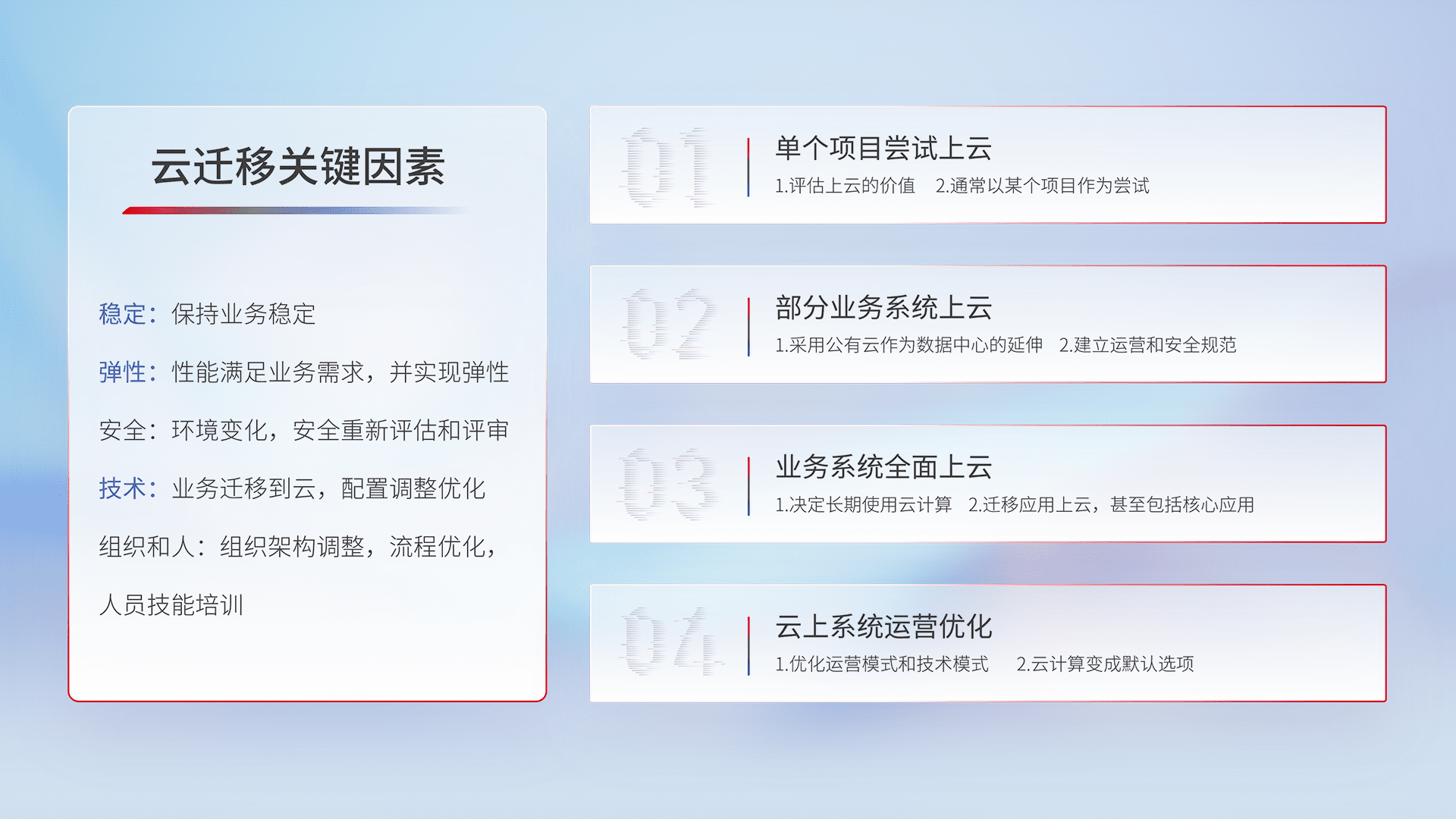 结合实际业务,,,,从规划设计、、、云平台选型、、、、云原生改造、、数据迁移、、、集成交付,,,迁移全过程为客户识别最佳上云路径,,做好风险识别管理,,,设计网络架构、、、、身份权限、、、安全审计合规、、、操作审计、、、日志审计、、监控告警策略、、、、多站点容灾设计等,,,对云上基础设施进行整体规划,,提升IT治理水平,,,,以满足弹性、、、、高可用、、高性能的需求。。